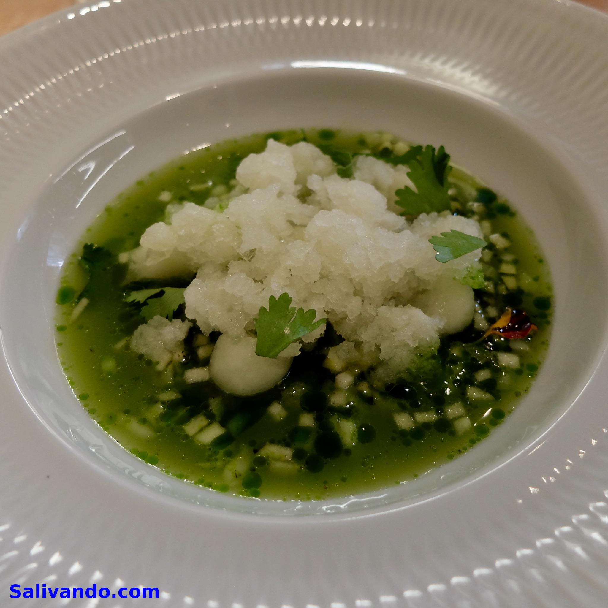 Otro plato que nos sorprendió gratamente en Tresde fue la sopa fría de pepino y jengibre con apio, melón y manzana verde. Desde una perspectiva nutricional, esta sopa es una auténtica joya: ligera, refrescante y cargada de ingredientes que aportan vitaminas, antioxidantes y fibra, perfecta para aquellos que buscan una opción saludable sin renunciar al sabor. La mezcla de sabores es sencillamente espectacular. El frescor del pepino se equilibra con el toque picante del jengibre, mientras que el apio aporta una textura crujiente y fresca. El melón y la manzana verde añaden un dulzor sutil que redondea el conjunto, logrando una combinación armónica y muy equilibrada. Ideal para quienes disfrutan de platos que revitalizan tanto el cuerpo como el paladar.