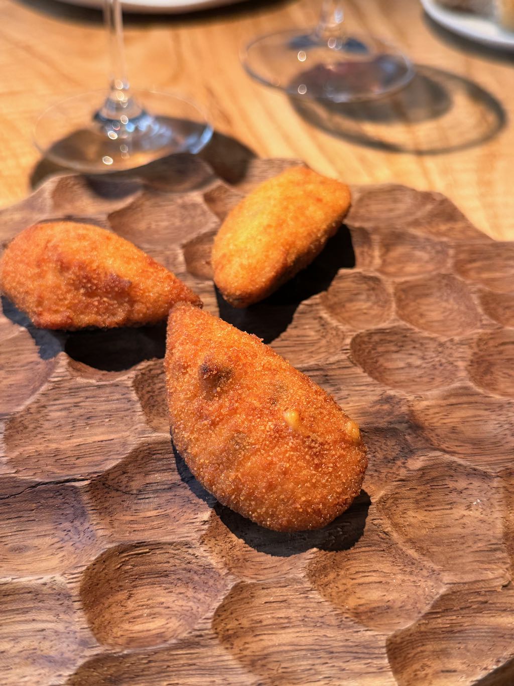 La anchoa sigue esa misma línea: materia prima de mucha calidad y un tratamiento mínimo, justo lo necesario para que destaque. La ensaladilla rusa con carabineros merece mención aparte. Muy cremosa, bien equilibrada y con el punto del carabinero que la eleva claramente por encima de lo habitual. De lo mejor de la comida.