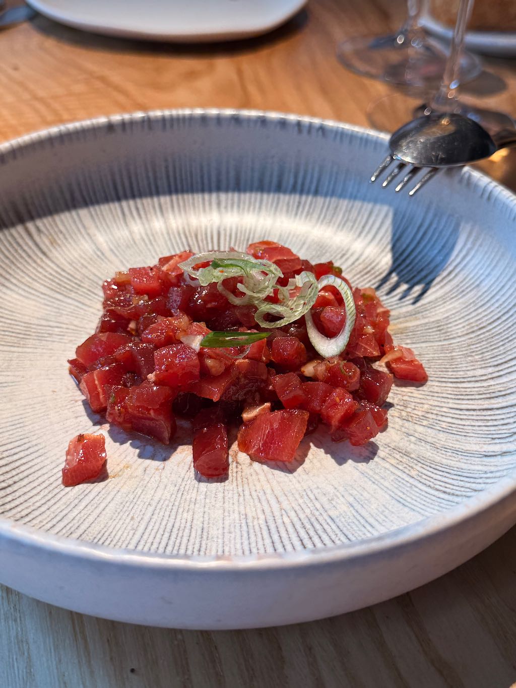 Los mejillones tigre están bien ejecutados, con un buen punto de fritura y un relleno sabroso, aunque sin robar protagonismo a otros platos. El tartar de atún es otro acierto, fresco, limpio y bien aliñado, sin enmascarar el producto. Pero si hay un plato que realmente destaca en esta parte del menú son las alcachofas con anguila y huevo. Muy top. Producto bien tratado, combinación potente pero equilibrada y un resultado que funciona muy bien.